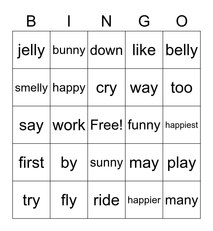 This bingo card has a free space and 24 words: by, fly, cry, try, belly, jelly, smelly, bunny, funny, sunny, way, say, may, play, happy, happier, happiest, down, too, work, many, first, like and ride.