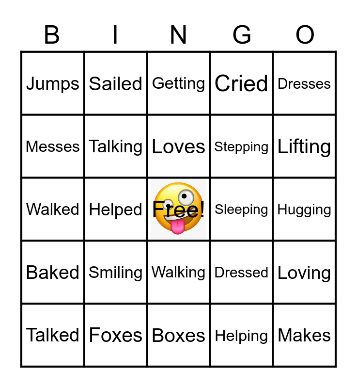 This bingo card has a free space and 29 words: Talked, Pets, Helped, Buzzed, Jumps, Getting, Talking, Smiling, Sleeping, Foxes, Hugging, Makes, Boxes, Helping, Lifting, Talks, Walking, Baked, Dresses, Walked, Dressed, Hugs, Stepping, Messes, Cried, Sailed, Loving, Loves and Planned.