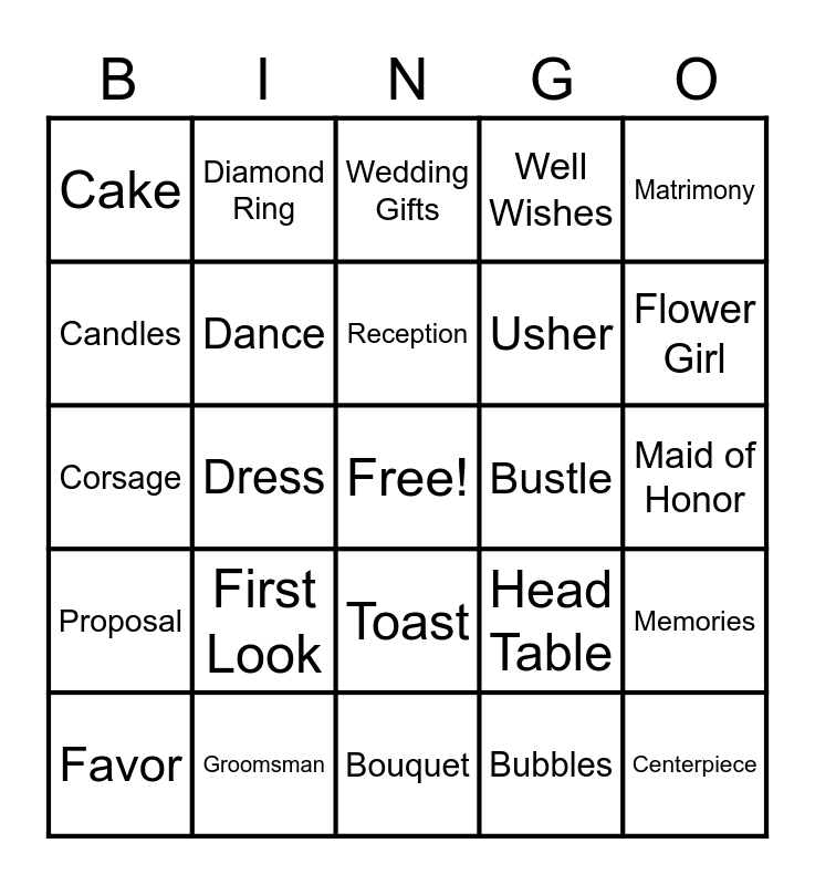 This bingo card has a free space and 29 words: Favor, Invitation, Dress, Best Man, Cake, Wedding Gifts, Dance, First Look, Bustle, Groomsman, Maid of Honor, Centerpiece, Bouquet, Bubbles, Flower Girl, Flowers, Toast, Proposal, Matrimony, Corsage, Head Table, Food, Usher, Candles, Well Wishes, Diamond Ring, Memories, Reception and Celebrate.