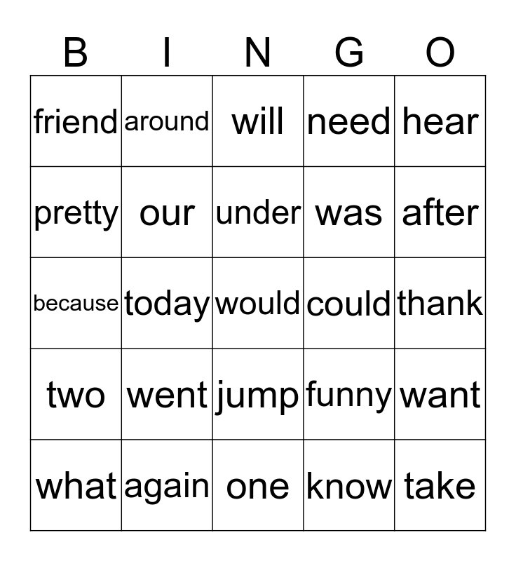 This bingo card has a free space and 24 words: went, again, under, what, hear, friend, pretty, around, could, jump, was, because, funny, want, our, know, thank, will, after, today, take, two, need and one.