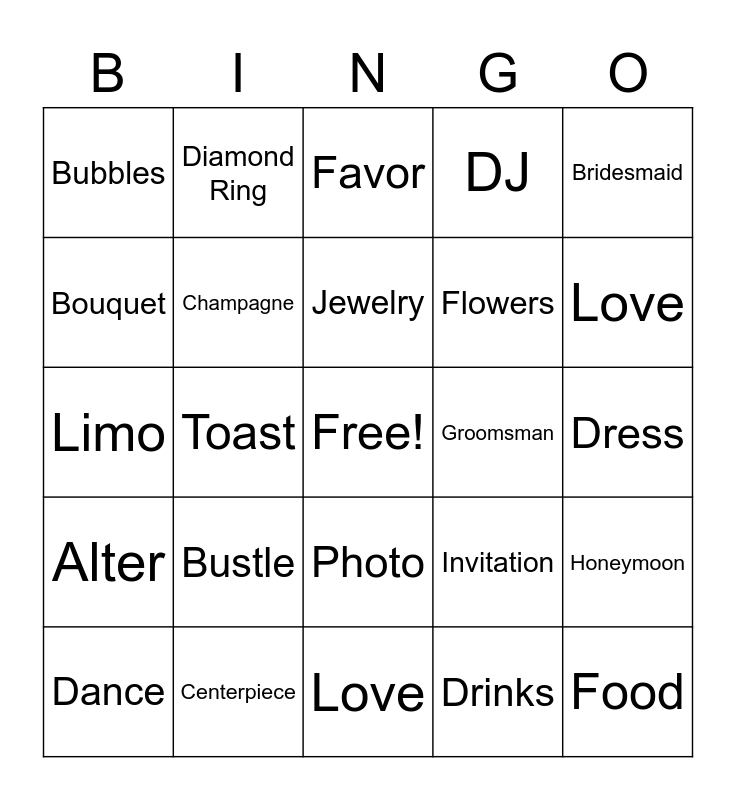 This bingo card has a free space and 29 words: Dance, Flower Girl, Toast, Proposal, Bubbles, Favor, Champagne, Bustle, Groomsman, Centerpiece, Dress, Food, Love, Drinks, Love, Vows, Photo, Alter, Bridesmaid, Limo, Invitation, First Look, Flowers, Bouquet, DJ, Diamond Ring, Honeymoon, Jewelry and Wedding Planner.