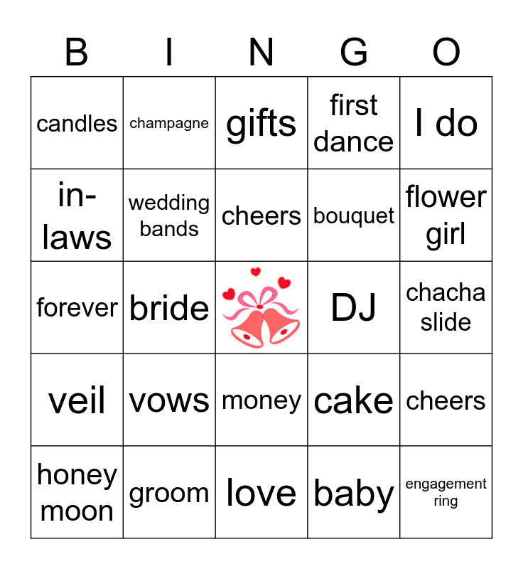 This bingo card has a free space and 24 words: vows, groom, cheers, honey moon, I do, candles, in-laws, champagne, DJ, money, bouquet, forever, cake, cheers, wedding bands, baby, chacha slide, gifts, flower girl, bride, engagement ring, veil, first dance and love.