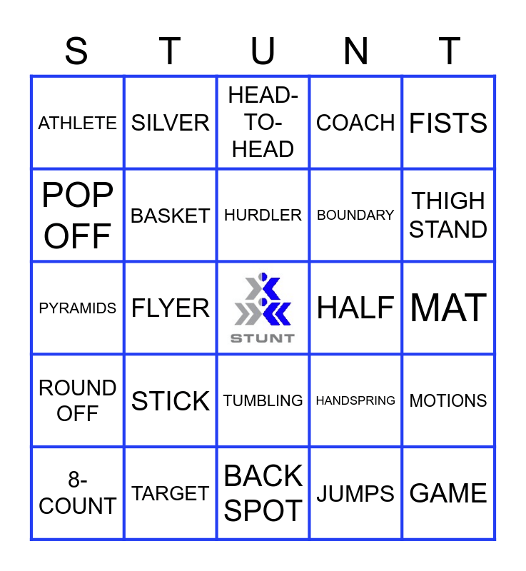 This bingo card has a free space and 55 words: 4 QUARTERS, 8-COUNT, ABSORB, ATHLETE, BACK SPOT, BASE, BASKET, BLUE, BOUNDARY, CIRCLE UP, COACH, COIN TOSS, CRADLE, EXECUTE, EXTENSION, FANS, FISTS, FLYER, FRONT SPOT, GAME, HALF, HALFTIME, HANDSPRING, HEAD-TO-HEAD, HIGH V, HURDLER, JUMPS, LIB, MAT, MOTIONS, MUSIC, PARTNER STUNTS, PERFORM, PIKE, POP OFF, PYRAMIDS, REFEREE, ROUND OFF, ROUTINE, SCORE, SILVER, SKILLS, SPECTATOR, SPORT, STICK, TARGET, TC, TEAM, TECHNIQUE, THIGH STAND, TITANS, TOSSES, TUCK, TUMBLING and WINNER.