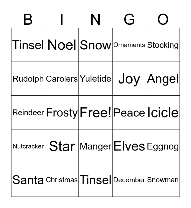 This bingo card has a free space and 24 words: Star, Christmas, Yuletide, Santa, Stocking, Tinsel, Rudolph, Noel, Peace, Manger, Joy, Reindeer, Elves, Eggnog, Carolers, December, Icicle, Snow, Angel, Frosty, Snowman, Nutcracker, Ornaments and Tinsel.
