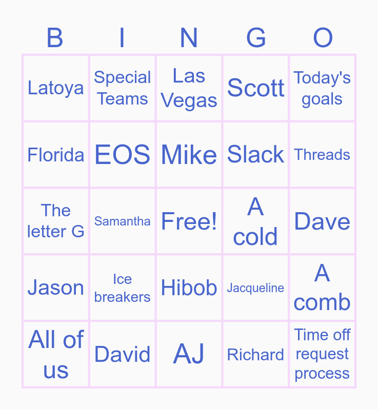 This bingo card has a free space and 27 words: Jacqueline, Jeneil, Slack, AJ, Florida, Las Vegas, Special Teams, Jason, A cold, A comb, The letter G, Scott, All of us, David, Threads, cryptocurrency, EOS, Mike, Ice breakers, Latoya, Dave, Richard, Samantha, Time off request process, Hibob, Today's goals and Holiday party.
