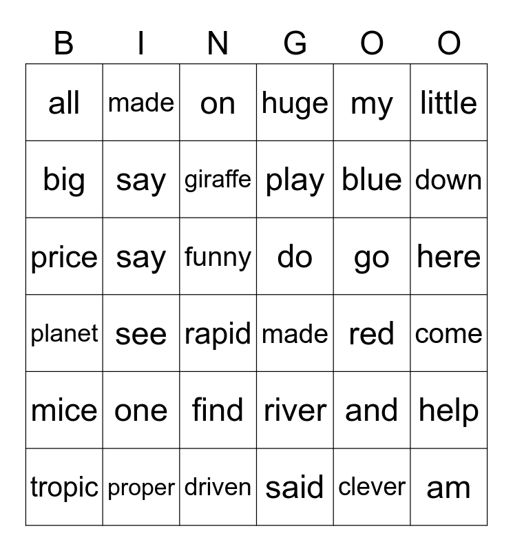 This bingo card has 49 words: mice, say, can, play, red, help, all, it, on, said, blue, little, big, see, FREE, made, go, here, tropic, made, funny, do, my, down, play, say, find, maid, and, come, be, one, driven, comet, clever, lemon, planet, proper, rapid, river, shiver, am, price, gems, giraffe, huge, peace, pace and edge.