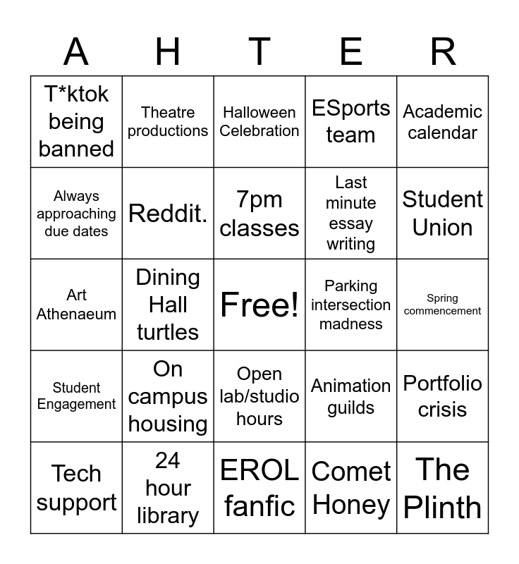 This bingo card has a free space and 27 words: Animation guilds, School of AHT, Last minute essay writing, EROL fanfic, Always approaching due dates, Halloween Celebration, Theatre productions, Student Engagement, Parking intersection madness, Portfolio crisis, Art Athenaeum, ESports team, Tech support, 24 hour library, Student Union, That one student always playing games in class, Reddit., 7pm classes, On campus housing, T*ktok being banned, Spring commencement, Comet Honey, Dining Hall turtles, The Plinth, Open lab/studio hours, Academic calendar and AHT otter.