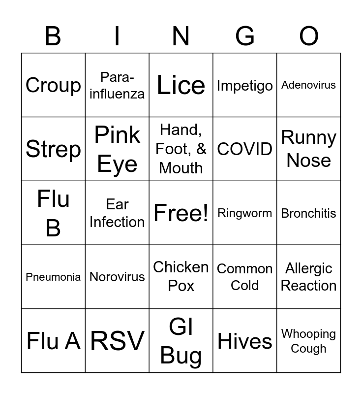 This bingo card has a free space and 24 words: Norovirus, RSV, Hand, Foot, & Mouth, Flu A, Adenovirus, Croup, Strep, Para-influenza, Ringworm, Chicken Pox, COVID, Flu B, Common Cold, Allergic Reaction, Pink Eye, Hives, Bronchitis, Lice, Runny Nose, Ear Infection, Whooping Cough, Pneumonia, Impetigo and GI Bug.