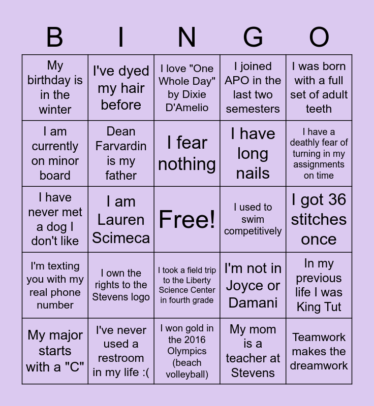 This bingo card has a free space and 24 words: I own the rights to the Stevens logo, I've never used a restroom in my life :(, I fear nothing, My major starts with a "C", I was born with a full set of adult teeth, My birthday is in the winter, I am currently on minor board, I've dyed my hair before, I used to swim competitively, I took a field trip to the Liberty Science Center in fourth grade, I have long nails, I have never met a dog I don't like, I'm not in Joyce or Damani, In my previous life I was King Tut, Dean Farvardin is my father, My mom is a teacher at Stevens, I got 36 stitches once, I love "One Whole Day" by Dixie D'Amelio, I have a deathly fear of turning in my assignments on time, I am Lauren Scimeca, Teamwork makes the dreamwork, I'm texting you with my real phone number, I joined APO in the last two semesters and I won gold in the 2016 Olympics (beach volleyball).