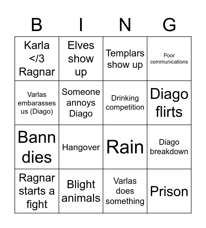 This bingo card has 16 words: Blight animals, Diago breakdown, Templars show up, Karla </3 Ragnar, Bann dies, Elves show up, Rain, Varlas does something, Varlas embarasses us (Diago), Someone annoys Diago, Ragnar starts a fight, Poor communications, Hangover, Diago flirts, Drinking competition and Prison.