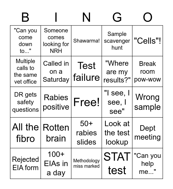 This bingo card has a free space and 24 words: Rotten brain, 100+ EIAs in a day, Test failure, Rejected EIA form, "Cells"!, "Can you come down to...", Multiple calls to the same vet office, Someone comes looking for NRH, "I see, I see, I see", 50+ rabies slides, "Where are my results?", DR gets safety questions, Look at the test lookup, Dept meeting, Called in on a Saturday, STAT test, Wrong sample, Shawarma!, Break room pow-wow, Rabies positive, "Can you help me...", All the fibro, Sample scavenger hunt and Methodology miss marked.