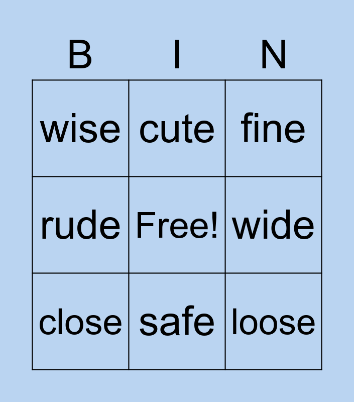 This bingo card has a free space and 8 words: wide, fine, cute, close, wise, loose, rude and safe.