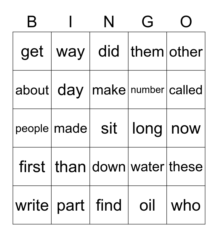 This bingo card has 30 words: part, may, made, come, get, did, day, down, long, find, now, sit, oil, who, called, been, water, first, than, other, people, could, way, number, about, them, these, write, make and more.
