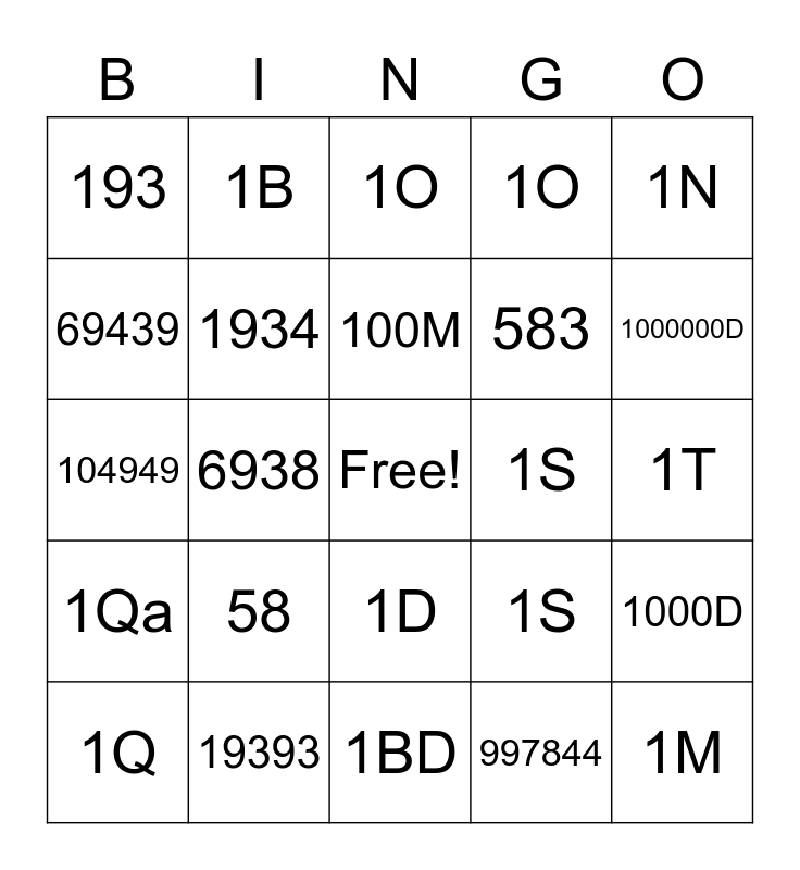 This bingo card has a free space and 24 words: 58, 19393, 100M, 1Q, 1N, 193, 69439, 1B, 1S, 1D, 583, 104949, 1S, 1000D, 1934, 997844, 1T, 1O, 1000000D, 6938, 1M, 1Qa, 1O and 1BD.