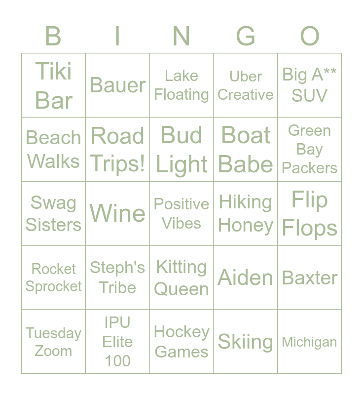 This bingo card has 32 words: Skiing, Cape Cod, Wine, Bull Riding, Rocket Sprocket, Road Trips!, Big A** SUV, Baxter, Bauer, Michigan, Bud Light, Lake Floating, Adventure Girl, Crunchy Cheetos, Hiking Honey, Slumber Party Sister, Tuesday Zoom, Swag Sisters, Kitting Queen, Steph's Tribe, Aiden, Family Vacation, Flip Flops, IPU Elite 100, Positive Vibes, Uber Creative, Boat Babe, Beach Walks, Tiki Bar, Hockey Games, Lakeside Living and Green Bay Packers.