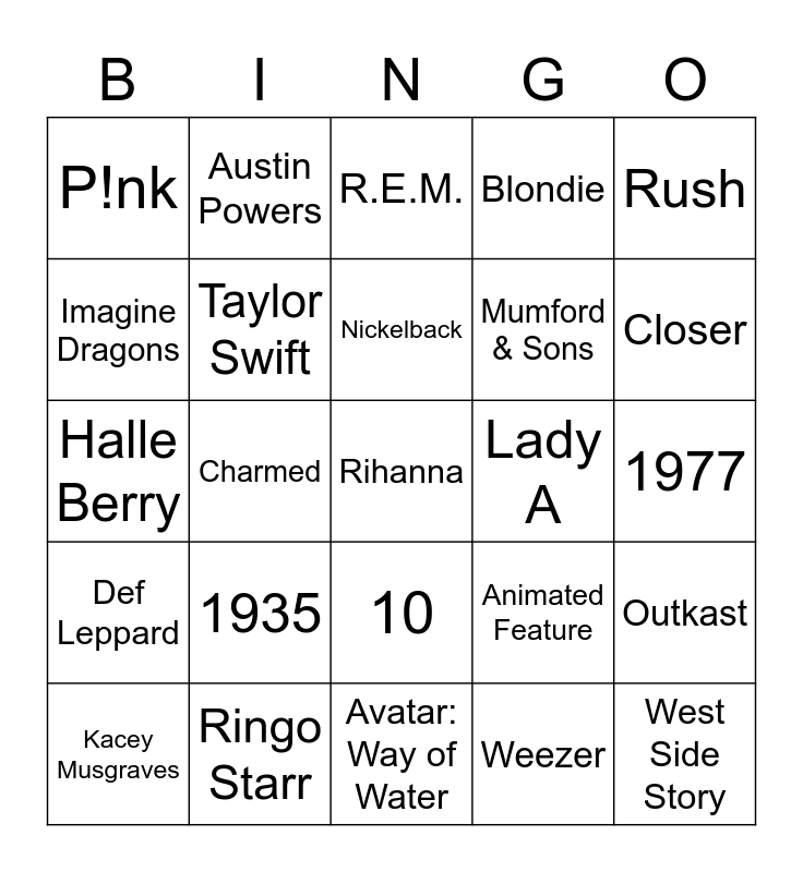 This bingo card has 59 words: Paul Simon, Ringo Starr, Ed Sheeran, Def Leppard, Weezer, The Cure, Taylor Swift, 2Pac, Mumford & Sons, Duran Duran, Blondie, Lady Gaga, Imagine Dragons, Death Cab for Cutie, Depeche Mode, P!nk, Rihanna, Rush, The Who, Nickelback, Lady A, R.E.M., Kacey Musgraves, Outkast, Beastie Boys, Jack Johnson, Drake, Shutter, Closer, One Hour Photo, Nightcrawler, The Secret Life of Walter Mitty, Rear Window, Memento, Austin Powers, Beetlejuice, Stranger Things, Charmed, Veronica Mars, Halle Berry, Short Round, 1935, 1977, Angela Bassett, 53, Walt Disney, 13, 6, 10, Avatar: Way of Water, 1929, 1966, Price Waterhouse Cooper, The Silence of the Lambs, La La Land, Animated Feature, Birdman, West Side Story and Moonlight.