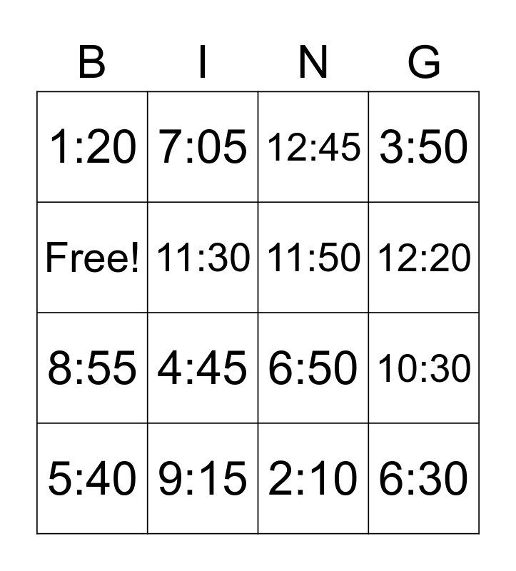 This bingo card has 16 words: 9:15, 10:30, 12:45, 1:20, 8:55, 7:05, 6:50, 2:10, Free!, 11:30, 5:40, 3:50, 4:45, 12:20, 11:50 and 6:30.