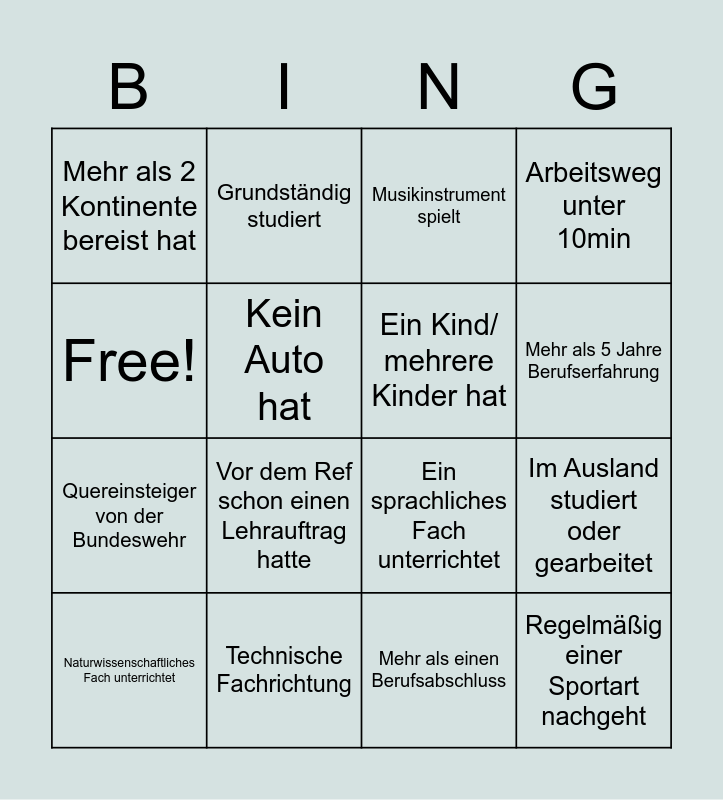 This bingo card has 16 words: Technische Fachrichtung, Im Ausland studiert oder gearbeitet, Musikinstrument spielt, Mehr als 2 Kontinente bereist hat, Quereinsteiger von der Bundeswehr, Grundständig studiert, Ein sprachliches Fach unterrichtet, Mehr als einen Berufsabschluss, Free!, Kein Auto hat, Naturwissenschaftliches Fach unterrichtet, Arbeitsweg unter 10min, Vor dem Ref schon einen Lehrauftrag hatte, Mehr als 5 Jahre Berufserfahrung, Ein Kind/ mehrere Kinder hat and Regelmäßig einer Sportart nachgeht.