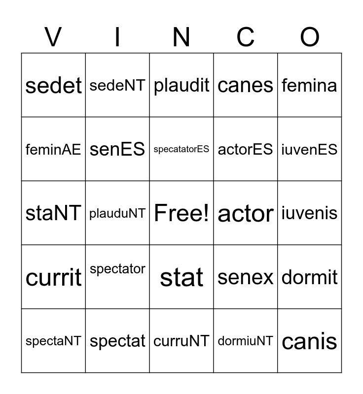 This bingo card has a free space and 24 words: spectator, spectat, specatatorES, spectaNT, femina, sedet, feminAE, sedeNT, actor, stat, actorES, staNT, senex, dormit, senES, dormiuNT, iuvenis, plaudit, iuvenES, plauduNT, canis, currit, canes and curruNT.