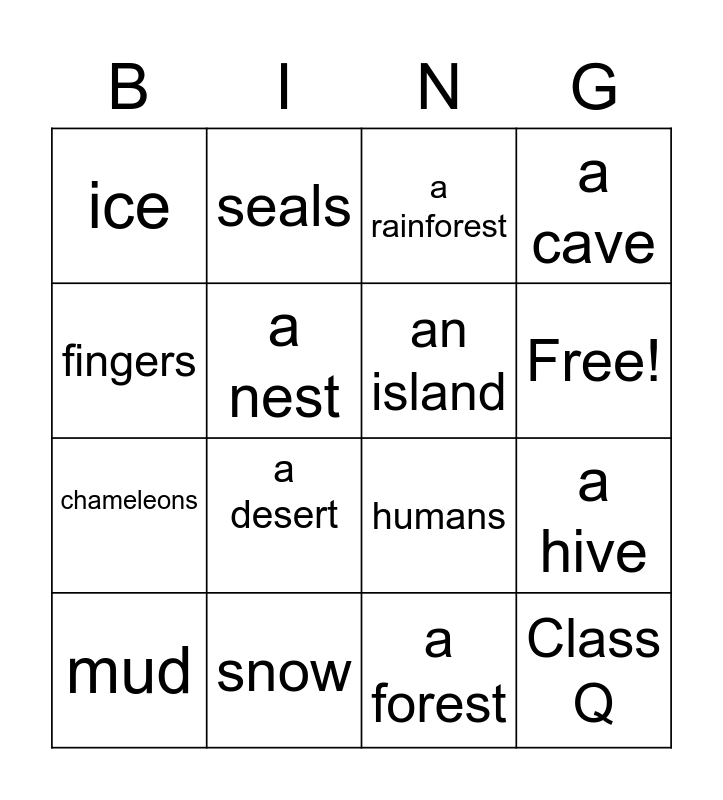 This bingo card has 17 words: a forest, mud, a rainforest, ice, a desert, a cave, a hive, an island, Free!, a nest, snow, humans, fingers, seals, chameleons, whiskers and Class Q.
