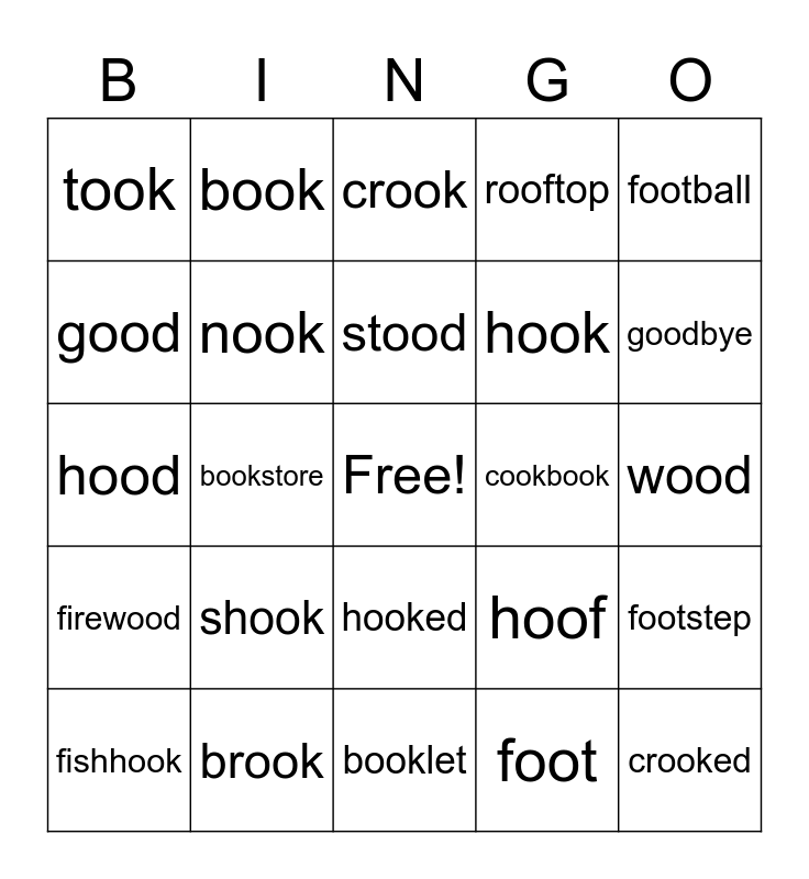 This bingo card has a free space and 24 words: shook, brook, stood, fishhook, football, took, good, book, cookbook, hooked, hook, hood, hoof, footstep, nook, foot, wood, crook, goodbye, bookstore, crooked, firewood, rooftop and booklet.