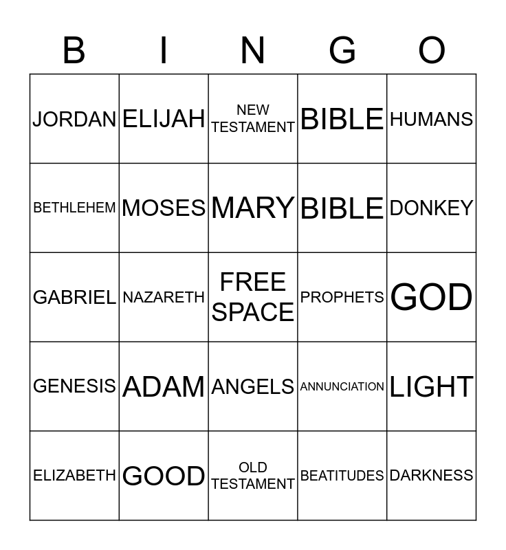 This bingo card has a free space and 24 words: ADAM, GOOD, MARY, ELIZABETH, HUMANS, JORDAN, BETHLEHEM, ELIJAH, PROPHETS, ANGELS, BIBLE, GABRIEL, ANNUNCIATION, LIGHT, MOSES, BEATITUDES, GOD, NEW TESTAMENT, DONKEY, NAZARETH, DARKNESS, GENESIS, BIBLE and OLD TESTAMENT.