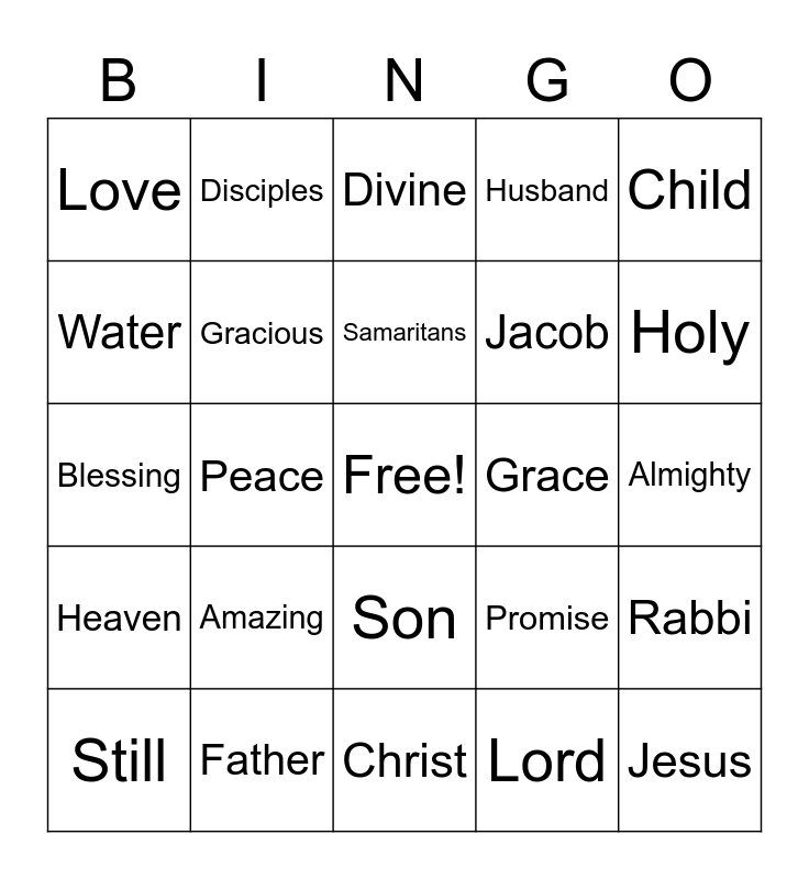 This bingo card has a free space and 29 words: Still, God, Peace, Heart, Love, Divine, Gracious, Amazing, Grace, Father, Almighty, Jesus, Christ, Lord, Holy, Spirit, Son, Heaven, Child, Blessing, Promise, Samaria, Jacob, Water, Husband, Disciples, Rabbi, Samaritans and Forgive.