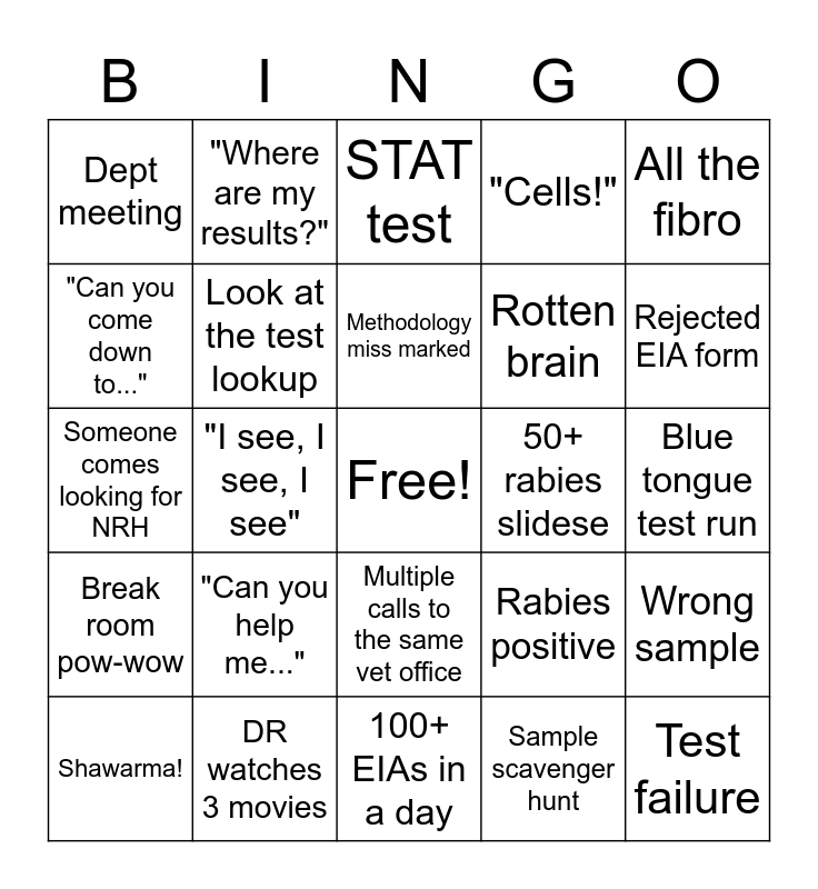 This bingo card has a free space and 24 words: "Can you help me...", DR watches 3 movies, Methodology miss marked, Shawarma!, All the fibro, Dept meeting, "Can you come down to...", "Where are my results?", 50+ rabies slidese, Multiple calls to the same vet office, Rotten brain, Someone comes looking for NRH, Rabies positive, Wrong sample, Look at the test lookup, Sample scavenger hunt, Blue tongue test run, STAT test, Rejected EIA form, "I see, I see, I see", Test failure, Break room pow-wow, "Cells!" and 100+ EIAs in a day.