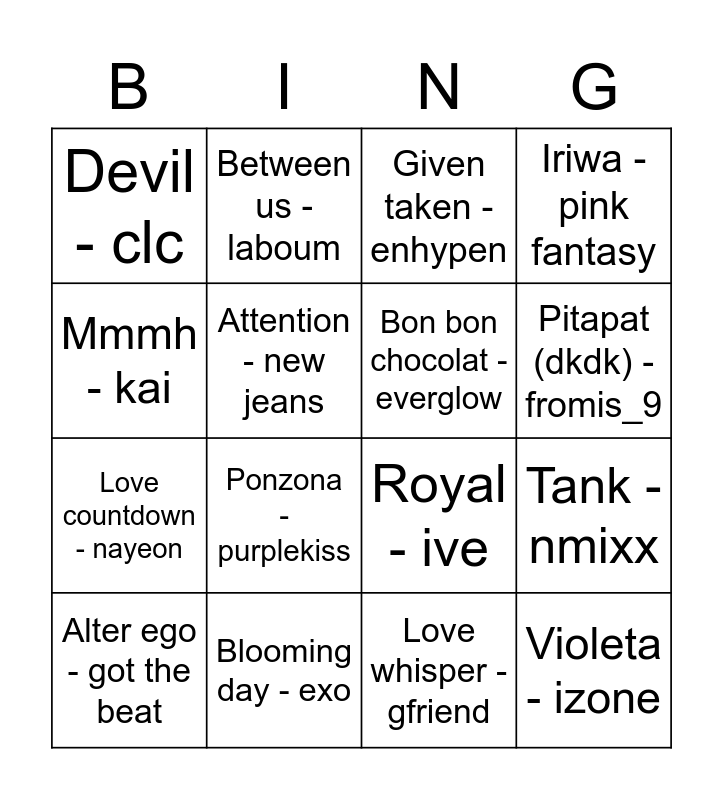This bingo card has 31 words: Savage - aespa, Alldaylong - dreamcatcher, Tank - nmixx, B’rave (a song for Matilda) - billlie, Devil - clc, Given taken - enhypen, Bon bon chocolat - everglow, Lady - exid, Blooming day - exo, Cupid - fifty fifty, Love whisper - gfriend, Alter ego - got the beat, The boys - snsd, The boots - gugudan, Ponzona - purplekiss, Mvsk - kep1er, Babe - hyuna, Croquis - eunbi, Violeta - izone, Pop/stars - k/da, Mmmh - kai, Bamboleo - red velvet, Red moon - kard, Between us - laboum, Love countdown - nayeon, Attention - new jeans, Iriwa - pink fantasy, Royal - ive, Wonderboy, the aerialist - gwsn, Pitapat (dkdk) - fromis_9 and Sweet crazy love - loona.