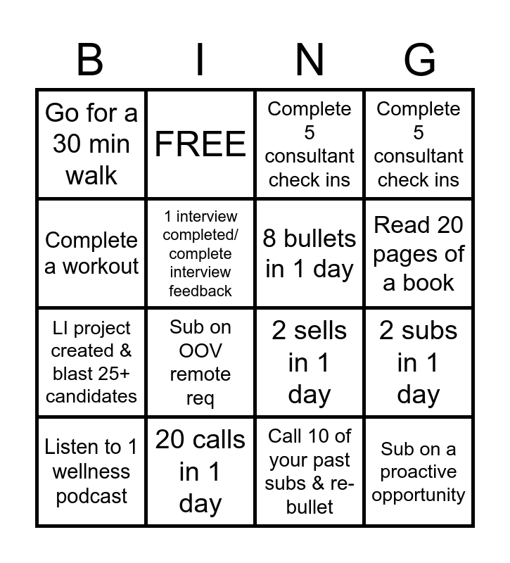 This bingo card has 16 words: 20 calls in 1 day, 2 subs in 1 day, Complete 5 consultant check ins, Go for a 30 min walk, LI project created & blast 25+ candidates, FREE, 2 sells in 1 day, Call 10 of your past subs & re-bullet, Complete a workout, 1 interview completed/ complete interview feedback, Listen to 1 wellness podcast, Complete 5 consultant check ins, Sub on OOV remote req, Read 20 pages of a book, 8 bullets in 1 day and Sub on a proactive opportunity.