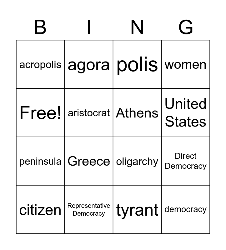 This bingo card has 16 words: Representative Democracy, Direct Democracy, polis, acropolis, peninsula, agora, oligarchy, tyrant, Free!, aristocrat, citizen, women, Greece, United States, Athens and democracy.