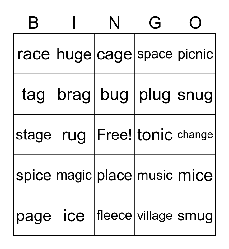 This bingo card has a free space and 24 words: magic, ice, bug, page, picnic, race, tag, huge, tonic, place, plug, stage, music, mice, brag, village, change, cage, snug, rug, smug, spice, space and fleece.