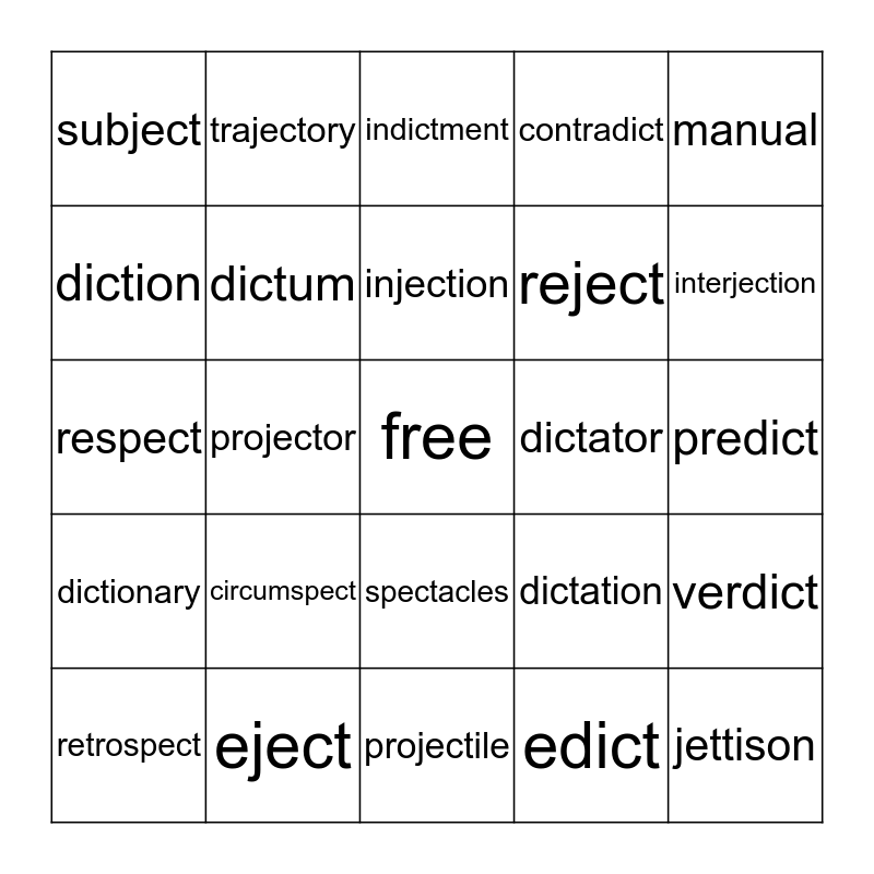 This bingo card has a free space and 24 words: circumspect, eject, injection, retrospect, manual, subject, diction, trajectory, dictator, spectacles, reject, respect, dictation, verdict, dictum, edict, predict, indictment, interjection, projector, jettison, dictionary, contradict and projectile.