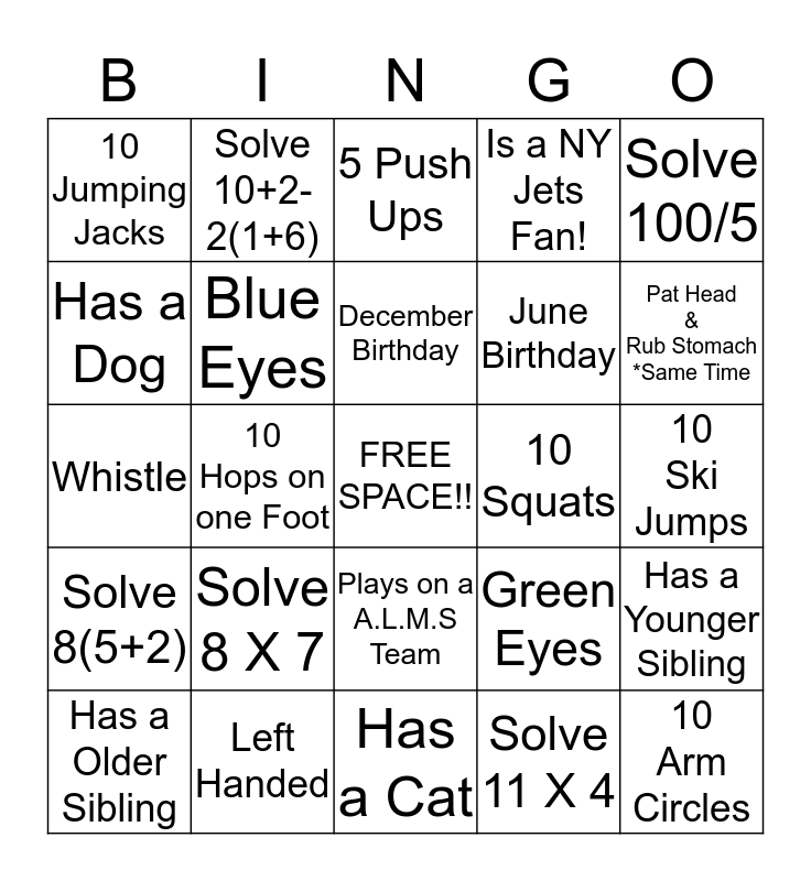 This bingo card has a free space and 24 words: Solve 8 X 7, Left Handed, December Birthday, Has a Older Sibling, Solve 100/5, 10 Jumping Jacks, Has a Dog, Solve 10+2-2(1+6), 10 Squats, Plays on a A.L.M.S Team, June Birthday, Whistle, Green Eyes, Has a Younger Sibling, Blue Eyes, Solve 11 X 4, 10 Ski Jumps, 5 Push Ups, Pat Head & Rub Stomach *Same Time, 10 Hops on one Foot, 10 Arm Circles, Solve 8(5+2), Is a NY Jets Fan! and Has a Cat.