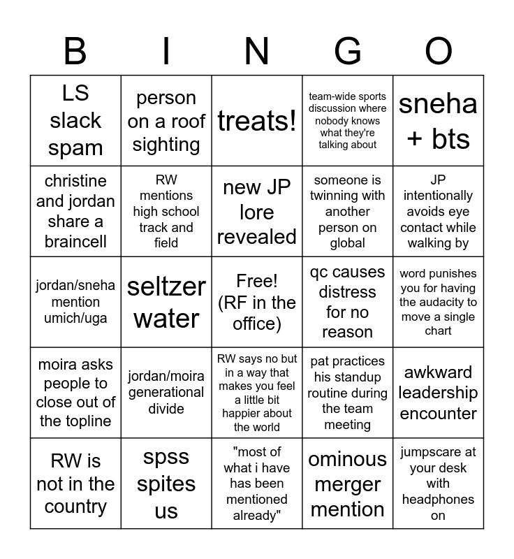 This bingo card has a free space and 24 words: jordan/moira generational divide, spss spites us, new JP lore revealed, RW is not in the country, sneha + bts, LS slack spam, christine and jordan share a braincell, person on a roof sighting, qc causes distress for no reason, RW says no but in a way that makes you feel a little bit happier about the world, someone is twinning with another person on global, jordan/sneha mention umich/uga, pat practices his standup routine during the team meeting, awkward leadership encounter, RW mentions high school track and field, ominous merger mention, word punishes you for having the audacity to move a single chart, treats!, JP intentionally avoids eye contact while walking by, seltzer water, jumpscare at your desk with headphones on, moira asks people to close out of the topline, team-wide sports discussion where nobody knows what they're talking about and "most of what i have has been mentioned already".