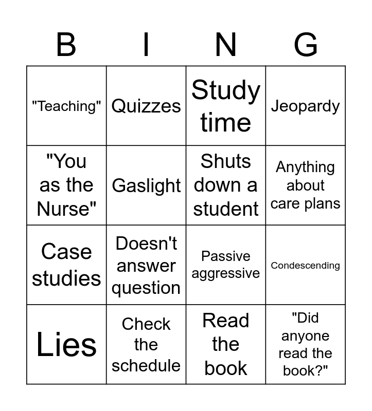 This bingo card has 16 words: Check the schedule, Condescending, Study time, "Teaching", Case studies, Quizzes, Passive aggressive, Read the book, "You as the Nurse", Gaslight, Lies, Jeopardy, Doesn't answer question, Anything about care plans, Shuts down a student and "Did anyone read the book?".