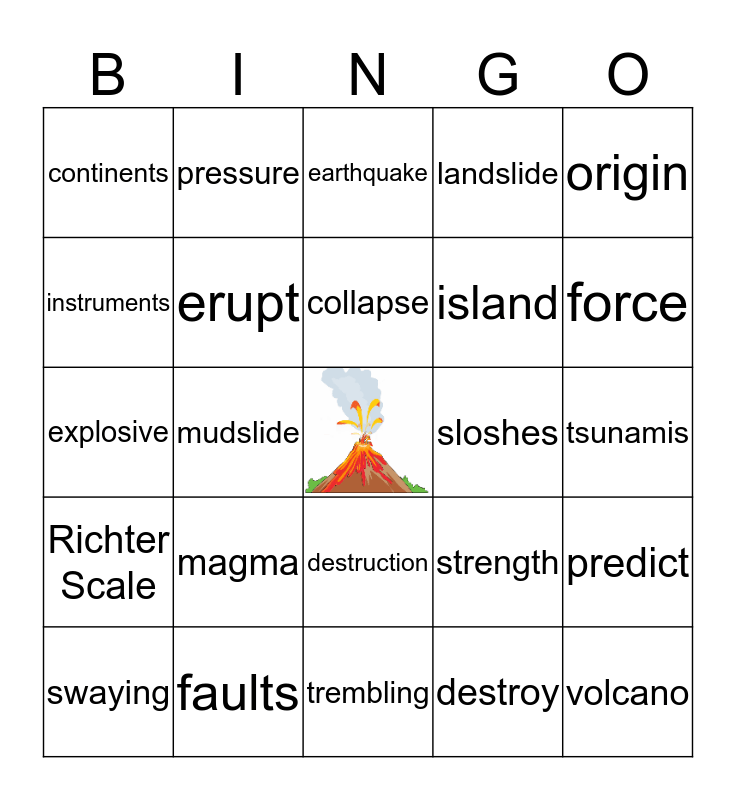 This bingo card has a free space and 24 words: magma, faults, collapse, swaying, origin, continents, instruments, pressure, sloshes, destruction, island, explosive, strength, predict, erupt, destroy, tsunamis, earthquake, force, mudslide, volcano, Richter Scale, landslide and trembling.