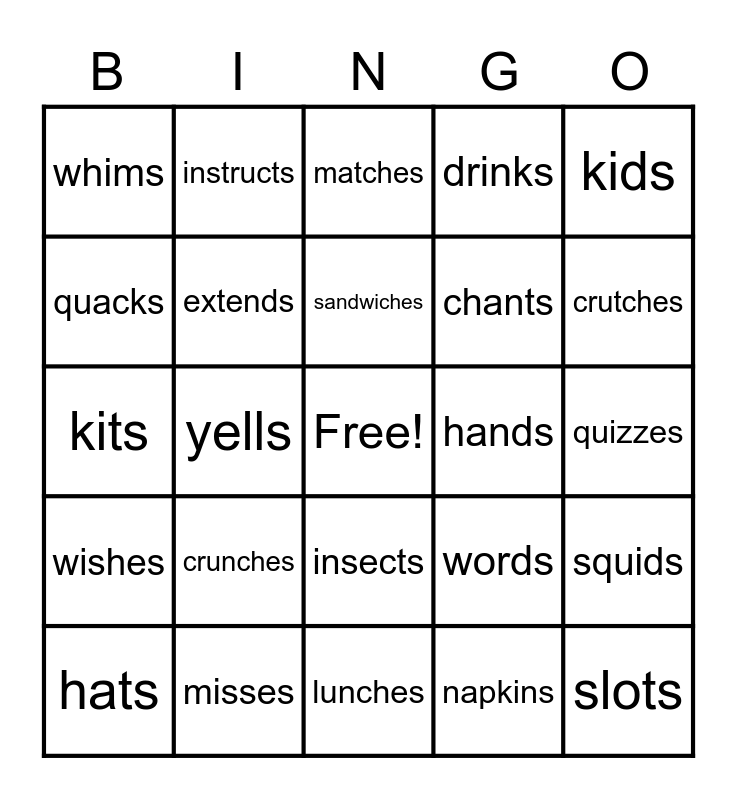 This bingo card has a free space and 34 words: boxes, napkins, habits, benches, wishes, extends, kids, hats, instructs, comets, sandwiches, matches, catches, foxes, hands, crutches, misses, kits, crunches, words, insects, paths, whims, quizzes, lunches, slots, drinks, whiffs, chants, quacks, ducks, yells, squids and twigs.