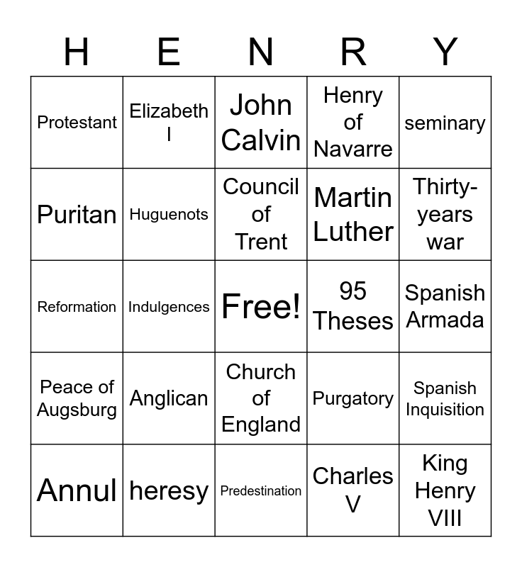 This bingo card has a free space and 24 words: Anglican, heresy, Council of Trent, Annul, seminary, Protestant, Puritan, Elizabeth I, 95 Theses, Church of England, Martin Luther, Reformation, Purgatory, Spanish Inquisition, Huguenots, Charles V, Spanish Armada, John Calvin, Thirty-years war, Indulgences, King Henry VIII, Peace of Augsburg, Henry of Navarre and Predestination.