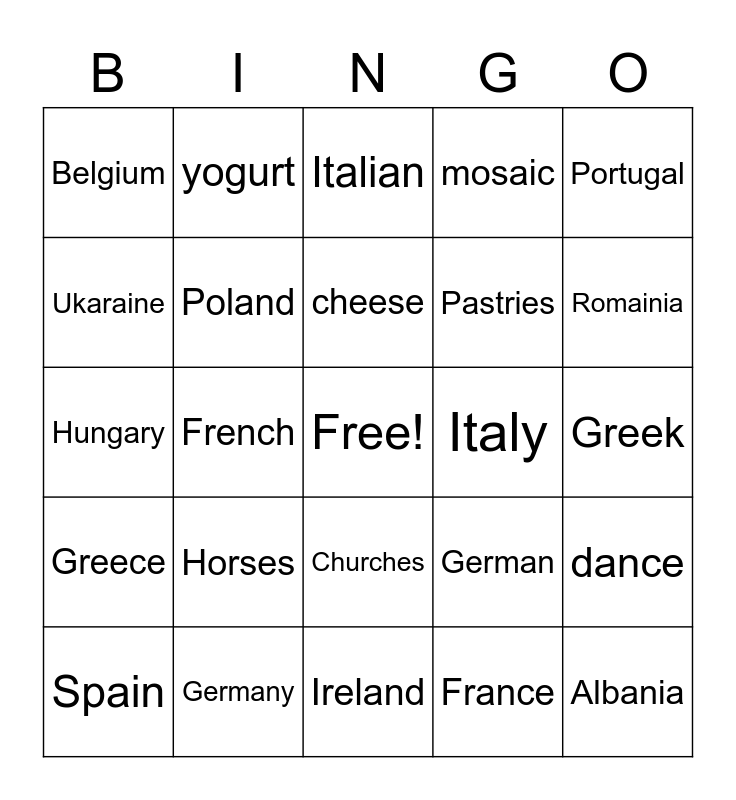 This bingo card has a free space and 29 words: Spain, Italian, French, Art, Belgium, Italian, Poland, Horses, Italy, Germany, Greek, Albania, Ireland, France, Romainia, Spanish, Churches, Greece, Portugal, Hungary, German, Polish, Pastries, Ukaraine, mosaic, yogurt, dance, cheese and salami.