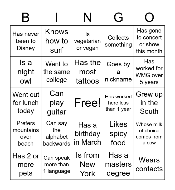 This bingo card has a free space and 45 words: Can touch their nose with their tongue, Wears contacts, Is a twin or has twin siblings, Has 2 or more pets, Doesn't drink coffee, Has a masters degree, Is vegetarian or vegan, Is left-handed, Has gone to concert or show this month, Can speak more than 1 language, Collects something, Has worked here less than 1 year, Has a birthday in March, Can say the alphabet backwards, Has 0 unread work emails, Is from New York, Has a birthday in September, Went out for lunch today, Identifies as an introvert, Has worked for WMG over 5 years, Knows how to surf, Lives the longest distance away from Nashville, Has traveled to 5+ countries, Has never been to Disney, Identifies as an extrovert, Grew up in the South, Is wearing a color other than green, Owns a dog, Likes spicy food, Prefers mountains over beach, Is the youngest child, Whose milk of choice comes from a cow, Has 3 or more siblings, Has been scuba diving or skydiving, Grew up on the west coast, Can play guitar, Whose favorite holiday is in the first half of year, Has dyed or cut their own hair, Has performed in a musical, Has the most tattoos, Is a night owl, Goes by a nickname, Has never had a cavity, Went to the same college and Writes their own songs.