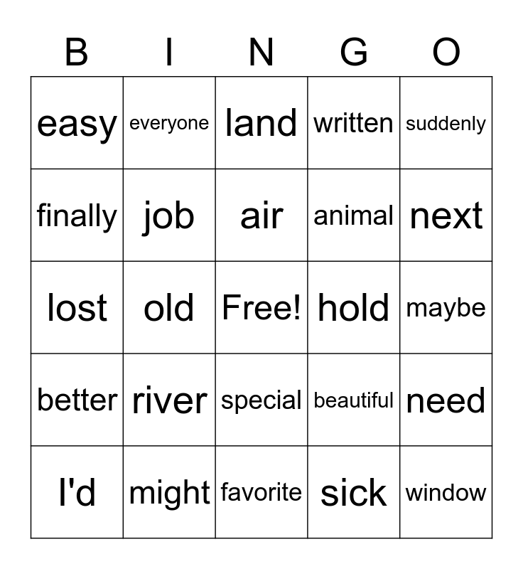 This bingo card has a free space and 24 words: river, might, air, I'd, suddenly, easy, finally, everyone, hold, special, animal, lost, beautiful, need, job, sick, maybe, land, next, old, window, better, written and favorite.