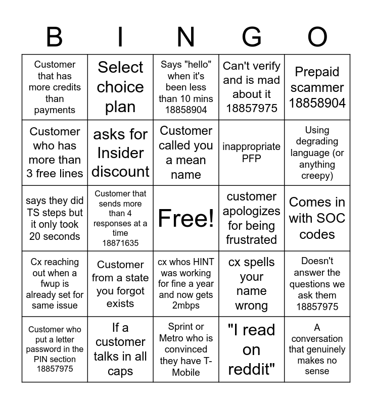 This bingo card has a free space and 24 words: Customer from a state you forgot exists, If a customer talks in all caps, Customer called you a mean name, Customer who put a letter password in the PIN section 18857975, Prepaid scammer 18858904, Customer that has more credits than payments, Customer who has more than 3 free lines, Select choice plan, customer apologizes for being frustrated, cx whos HINT was working for fine a year and now gets 2mbps, inappropriate PFP, says they did TS steps but it only took 20 seconds, cx spells your name wrong, Doesn't answer the questions we ask them 18857975, asks for Insider discount, "I read on reddit", Comes in with SOC codes, Says "hello" when it's been less than 10 mins 18858904, Using degrading language (or anything creepy), Customer that sends more than 4 responses at a time 18871635, A conversation that genuinely makes no sense, Cx reaching out when a fwup is already set for same issue, Can't verify and is mad about it 18857975 and Sprint or Metro who is convinced they have T-Mobile.