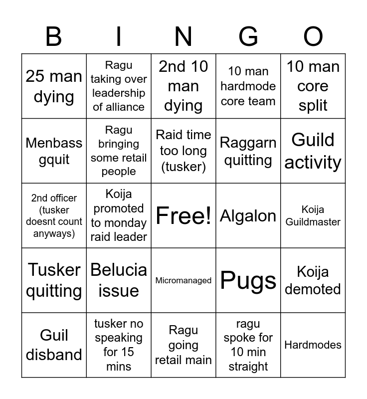 This bingo card has a free space and 24 words: Belucia issue, tusker no speaking for 15 mins, Raid time too long (tusker), Guil disband, 10 man core split, 25 man dying, Menbass gquit, Ragu taking over leadership of alliance, Algalon, Micromanaged, Raggarn quitting, 2nd officer (tusker doesnt count anyways), Pugs, Koija demoted, Ragu bringing some retail people, ragu spoke for 10 min straight, Koija Guildmaster, 2nd 10 man dying, Guild activity, Koija promoted to monday raid leader, Hardmodes, Tusker quitting, 10 man hardmode core team and Ragu going retail main.