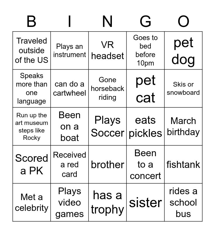 This bingo card has a free space and 24 words: Received a red card, Plays video games, Gone horseback riding, Met a celebrity, pet dog, Traveled outside of the US, Speaks more than one language, Plays an instrument, eats pickles, brother, pet cat, Run up the art museum steps like Rocky, Been to a concert, fishtank, can do a cartwheel, sister, March birthday, VR headset, Skis or snowboard, Been on a boat, rides a school bus, Scored a PK, Goes to bed before 10pm and has a trophy.