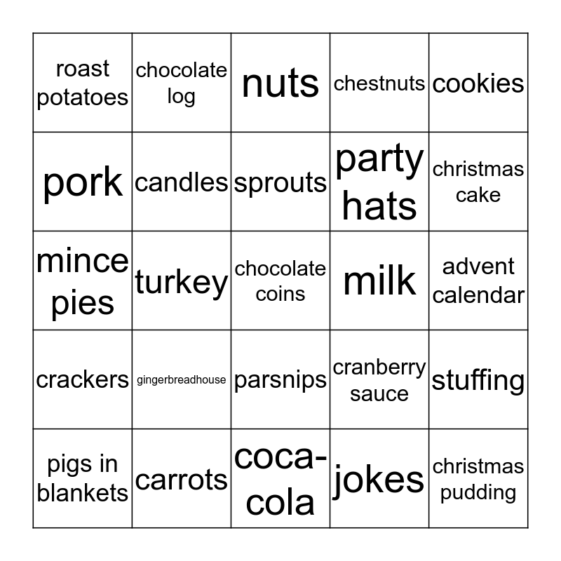 This bingo card has a free space and 24 words: gingerbreadhouse, carrots, sprouts, pigs in blankets, cookies, roast potatoes, pork, chocolate log, milk, parsnips, party hats, mince pies, cranberry sauce, stuffing, candles, jokes, advent calendar, nuts, christmas cake, turkey, christmas pudding, crackers, chestnuts and coca-cola.
