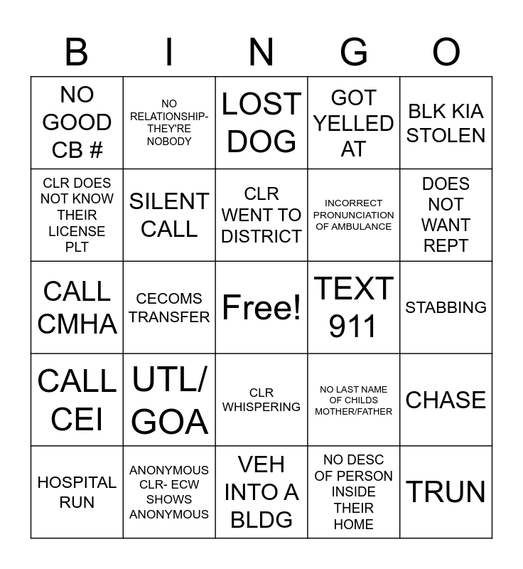 This bingo card has a free space and 24 words: HOSPITAL RUN, UTL/ GOA, CLR WENT TO DISTRICT, NO DESC OF PERSON INSIDE THEIR HOME, BLK KIA STOLEN, NO GOOD CB #, NO RELATIONSHIP-THEY'RE NOBODY, LOST DOG, TEXT 911, STABBING, CALL CMHA, SILENT CALL, NO LAST NAME OF CHILDS MOTHER/FATHER, CHASE, CLR DOES NOT KNOW THEIR LICENSE PLT, ANONYMOUS CLR- ECW SHOWS ANONYMOUS, VEH INTO A BLDG, GOT YELLED AT, DOES NOT WANT REPT, CALL CEI, CECOMS TRANSFER, CLR WHISPERING, INCORRECT PRONUNCIATION OF AMBULANCE and TRUN.