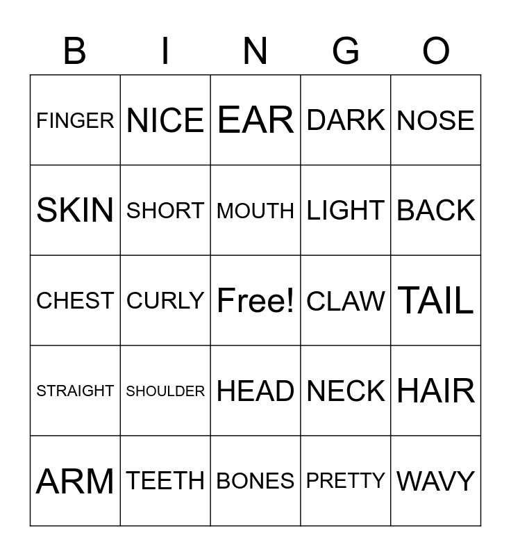 This bingo card has a free space and 32 words: PRETTY, LONG, CURLY, STRONG, STRAIGHT, SHORT, NOSE, HAIR, NICE, EYES, MOUTH, EAR, LEG, PAW, CLAW, SHELL, ARM, CHEST, HEAD, SHOULDER, NECK, HAND, TAIL, TEETH, WAVY, DARK, LIGHT, SKIN, FINGER, BONES, BODY and BACK.