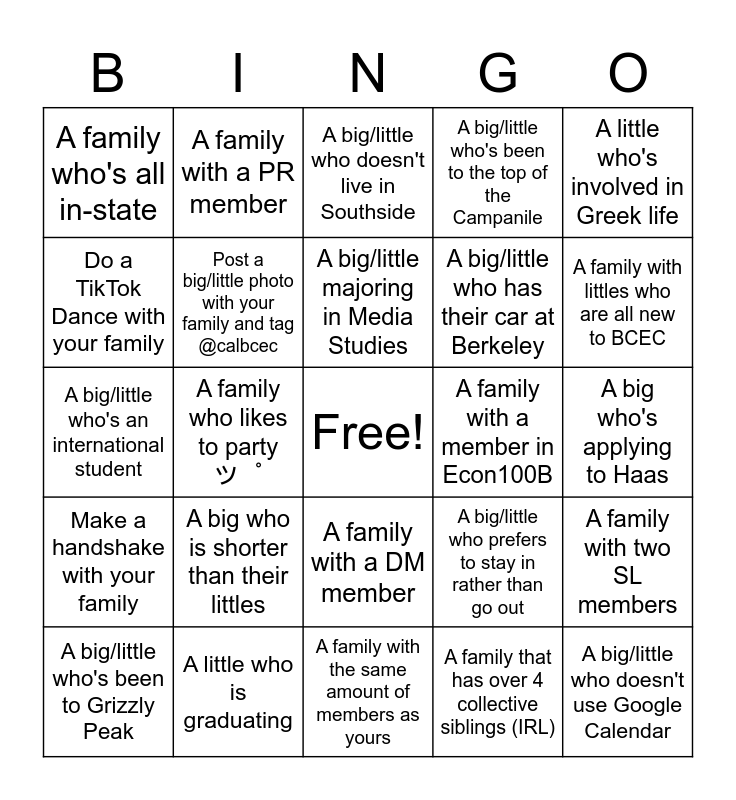 This bingo card has a free space and 24 words: A big who is shorter than their littles, A little who is graduating, A big/little majoring in Media Studies, A big/little who's been to Grizzly Peak, A little who's involved in Greek life, A family who's all in-state, Do a TikTok Dance with your family, A family with a PR member, A family with a member in Econ100B, A family with a DM member, A big/little who has their car at Berkeley, A big/little who's an international student, A big/little who prefers to stay in rather than go out, A family with two SL members, Post a big/little photo with your family and tag @calbcec, A family that has over 4 collective siblings (IRL), A big who's applying to Haas, A big/little who doesn't live in Southside, A family with littles who are all new to BCEC, A family who likes to party ツ゚, A big/little who doesn't use Google Calendar, Make a handshake with your family, A big/little who's been to the top of the Campanile and A family with the same amount of members as yours.