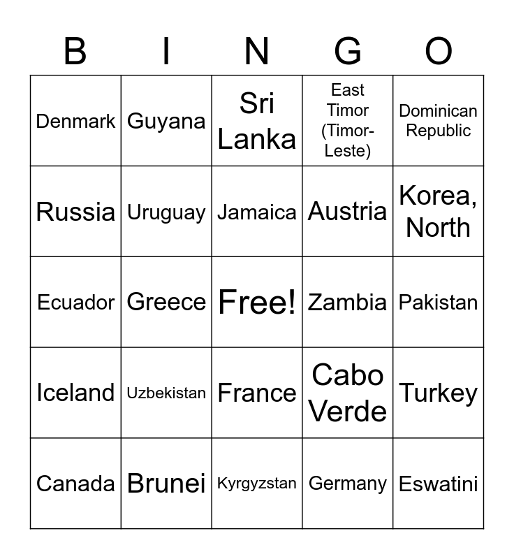 This bingo card has a free space and 196 words: Afghanistan, Albania, Algeria, Andorra, Angola, Antigua and Barbuda, Argentina, Armenia, Australia, Austria, Azerbaijan, The Bahamas, Bahrain, Bangladesh, Barbados, Belarus, Belgium, Belize, Benin, Bhutan, Bolivia, Bosnia and Herzegovina, Botswana, Brazil, Brunei, Bulgaria, Burkina Faso, Burundi, Cabo Verde, Cambodia, Cameroon, Canada, Central African Republic, Chad, Chile, China, Colombia, Comoros, Congo, Democratic Republic of the, Congo, Republic of the, Costa Rica, Côte d’Ivoire, Croatia, Cuba, Cyprus, Czech Republic, Denmark, Djibouti, Dominica, Dominican Republic, East Timor (Timor-Leste), Ecuador, Egypt, El Salvador, Equatorial Guinea, Eritrea, Estonia, Eswatini, Ethiopia, Fiji, Finland, France, Gabon, The Gambia, Georgia, Germany, Ghana, Greece, Grenada, Guatemala, Guinea, Guinea-Bissau, Guyana, Haiti, Honduras, Hungary, Iceland, India, Indonesia, Iran, Iraq, Ireland, Israel, Italy, Jamaica, Japan, Jordan, Kazakhstan, Kenya, Kiribati, Korea, North, Korea, South, Kosovo, Kuwait, Kyrgyzstan, Laos, Latvia, Lebanon, Lesotho, Liberia, Libya, Liechtenstein, Lithuania, Luxembourg, Madagascar, Malawi, Malaysia, Maldives, Mali, Malta, Marshall Islands, Mauritania, Mauritius, Mexico, Micronesia, Federated States of, Moldova, Monaco, Mongolia, Montenegro, Morocco, Mozambique, Myanmar (Burma), Namibia, Nauru, Nepal, Netherlands, New Zealand, Nicaragua, Niger, Nigeria, North Macedonia, Norway, Oman, Pakistan, Palau, Panama, Papua New Guinea, Paraguay, Peru, Philippines, Poland, Portugal, Qatar, Romania, Russia, Rwanda, Saint Kitts and Nevis, Saint Lucia, Saint Vincent and the Grenadines, Samoa, San Marino, Sao Tome and Principe, Saudi Arabia, Senegal, Serbia, Seychelles, Sierra Leone, Singapore, Slovakia, Slovenia, Solomon Islands, Somalia, South Africa, Spain, Sri Lanka, Sudan, Sudan, South, Suriname, Sweden, Switzerland, Syria, Taiwan, Tajikistan, Tanzania, Thailand, Togo, Tonga, Trinidad and Tobago, Tunisia, Turkey, Turkmenistan, Tuvalu, Uganda, Ukraine, United Arab Emirates, United Kingdom, United States, Uruguay, Uzbekistan, Vanuatu, Vatican City, Venezuela, Vietnam, Yemen, Zambia and Zimbabwe.